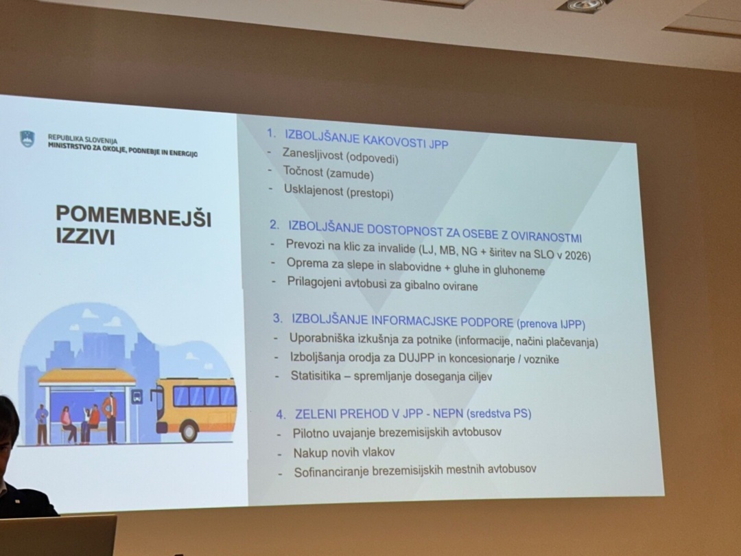 Družba za upravljanje javnega potniškega prometa (DUJPP) je na strokovnem srečanju Dan potnika konec novembra prisluhnila različnim deležnikom javnega potniškega prometa ter skupaj z njimi iskala odgovore na vprašanje, kakšen JPP želimo v Sloveniji razvijati v prihodnje. Dogodek je združil predstavnike ministrstev, občin, prevoznikov, mladinskih organizacij in regijskih centrov mobilnosti.