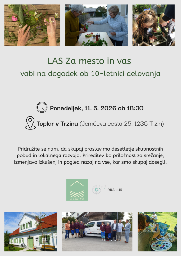 Lokalna akcijska skupina LAS Za mesto in vas, ki jo vodimo na Regionalni razvojni agenciji Ljubljanske urbane regije (RRA LUR), letos obeležuje 10 let delovanja. Ob tej prelomnici vas vabimo na srečanje, s katerim bomo skupaj z obstoječimi in nekdanjimi partnerji, člani ter podporniki lokalnega razvoja počastili pomemben mejnik skupne poti.